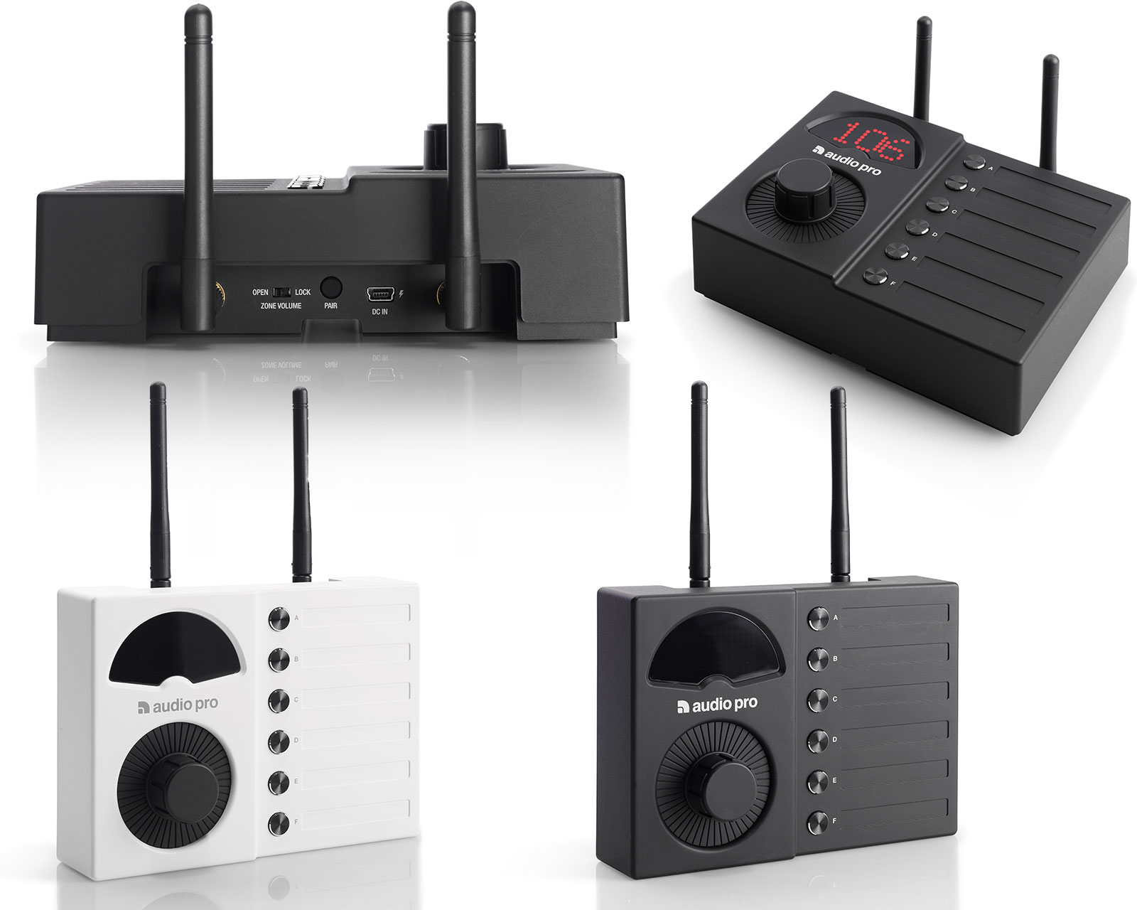 • Funksender zur drahtlosen Audioübertragung für bis zu 31 Lautsprecher in sechs Lautstärke-Zonen.